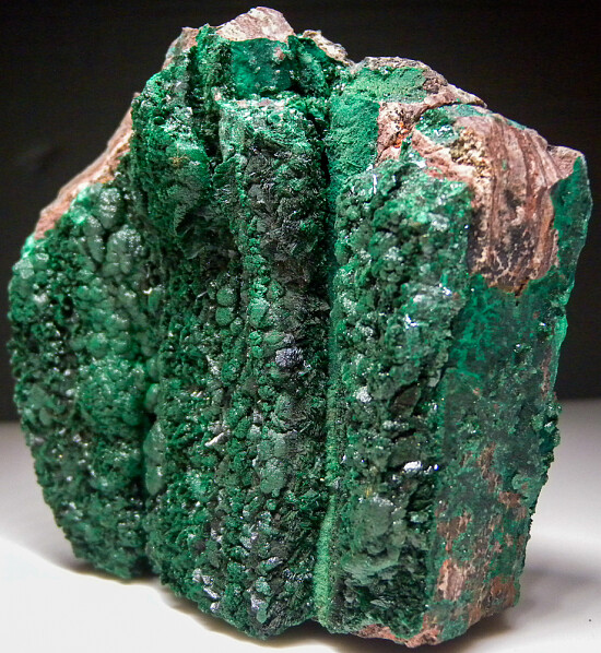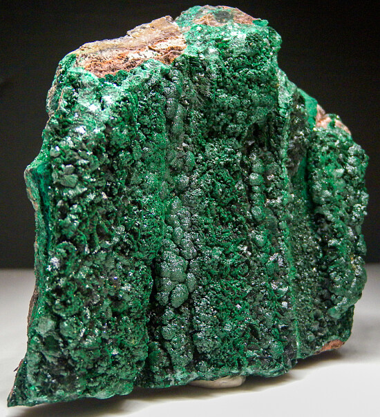 Large display specimen of Malachite crystals on matrix from the Katanga copper zone in the Democratic Republic of Congo. The Malachite forms a variety of velvety crystal shapes all over the front and part of the sides and back of specimen. Small tufts, wedge-shaped crystals, and botryoidal forms are all present. Clean and bright example of the fabulous Malachite that occurs in this area.