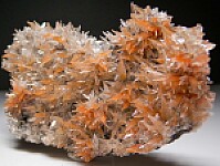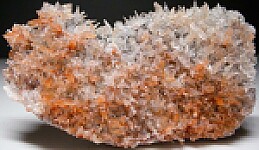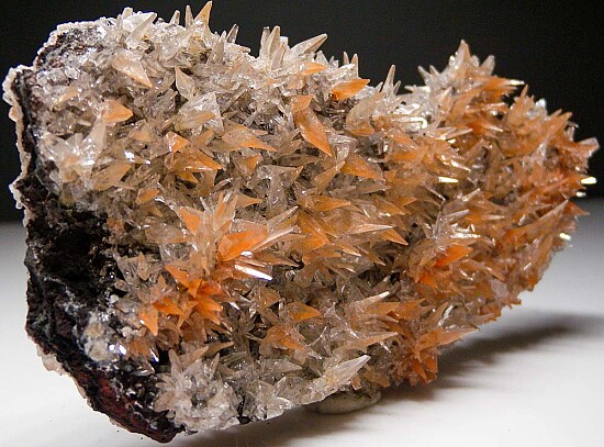 Transparent, spikey and elongated Calcite crystals on matrix from China. The Calcite are colorless with inclusions of red Hematite in areas. The crystals densely cover both sides of the thin rock matrix.
