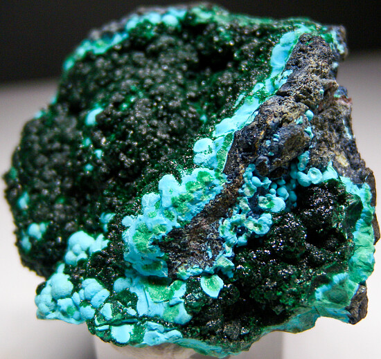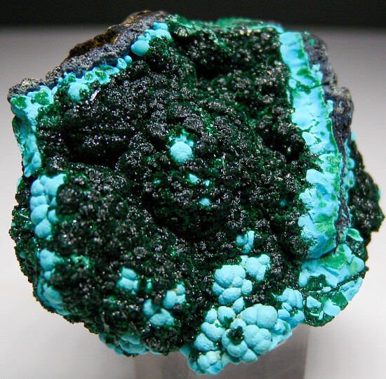 Striking and colorful combination of crystalline Malachite atop botryoidal sky blue Chrysocolla from the Katanaga copper belt in the Congo. Good Malachite crystals!