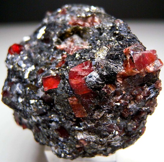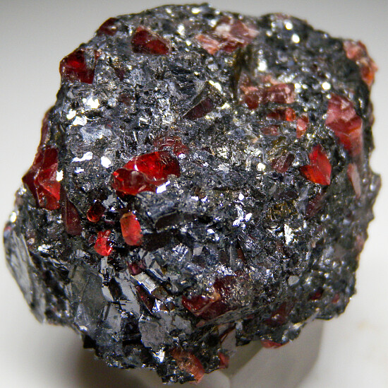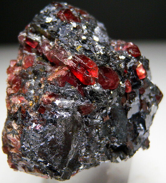 Bright cherry-red crystals of Rhodonite embedded in angular, metallic Galena. Though not large, the Rhodonite are numerous and some show transparency.