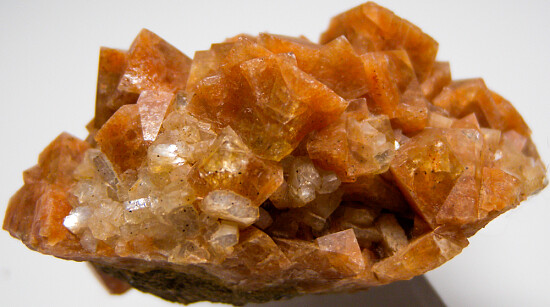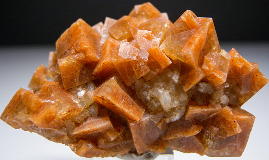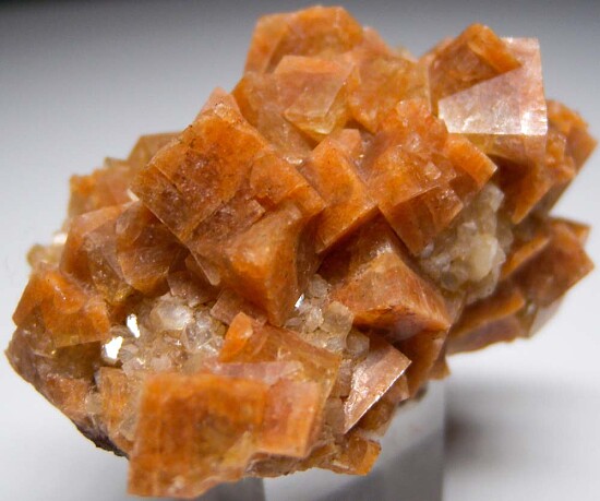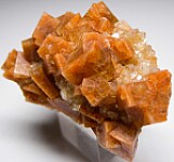 Fine quality orange Chabazite crystals intergrown with Huelandite. The Chabazite form sharp, distinct crystals to 1.2cm in size with a rich, deep orange color. Recently acquired from a private collection and comes with 2 old labels.