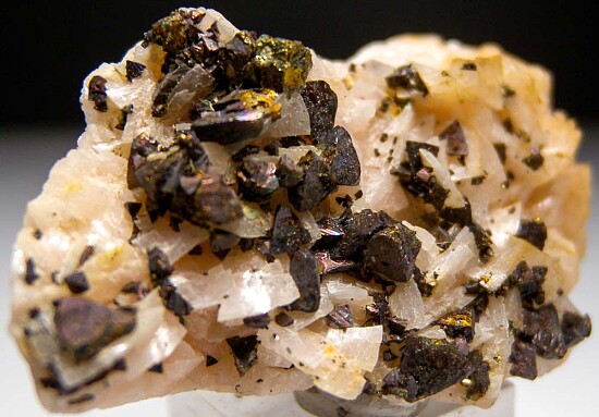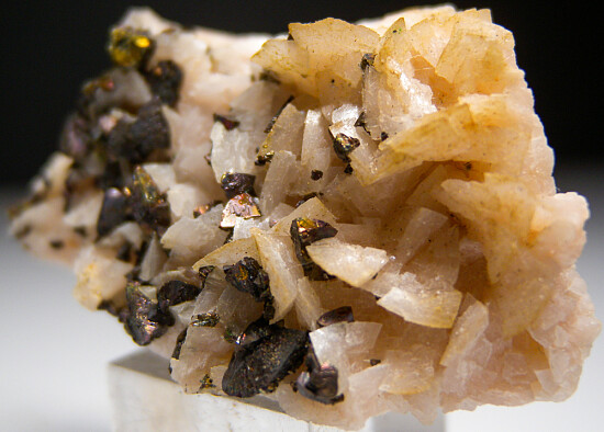 Brassy metallic crystals of Chalcopyrite spinkled atop pink curving crystals of Dolomite. Recently acquired from a private collection and comes with an old label.