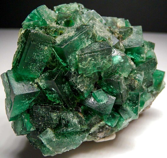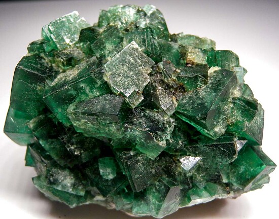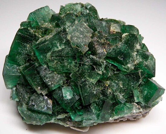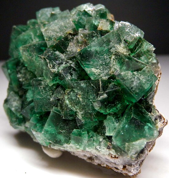 Classic deep green cubes of Fluorite from the Rogerley Mine in England. This is a well balanced specimen in great condition with good sized crystals to over 2cm in size.