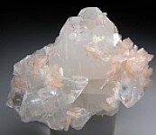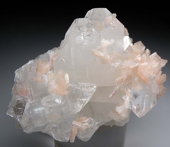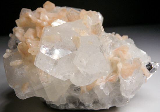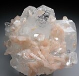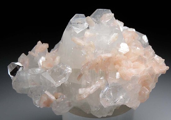 Large and showy example of pink Stilbite crystals on highly glassy, colorless Apophyllite crystals. Large 6cm Apophyllite crystals are well centered and accented by smaller Apophyllite crystals and the Stilbite. Very aesthetic and better in person. Valued at $150-$200 (and I would value higher for sheer beauty, but valued lower because of the number of available Indian Zeolite minerals).