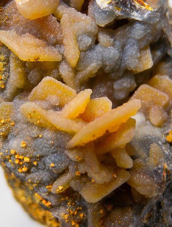 Sugary-looking drusy Quartz covering orange Wulfenite crystals. Individual Wulfenite crystals reach 7mm on edge. These are Arizona classics.