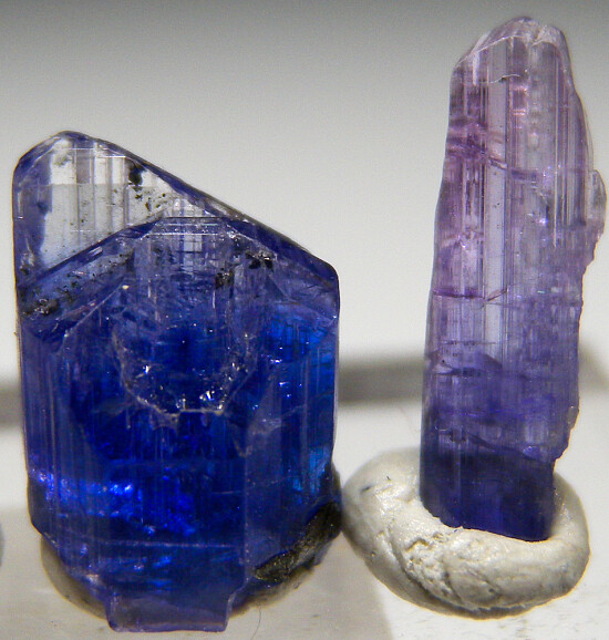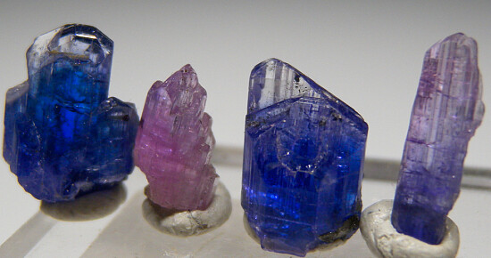 Tanzanite color suite of 4 crystals. From left to right: step termination deep blue crystal, pink Tanzanite, classic deep blue Tanzanite, and lastly a bi-color pink over blue Tanzanite. All are terminated and complete all around.