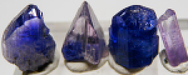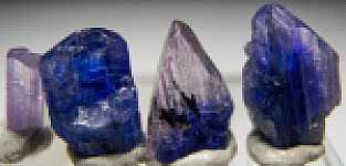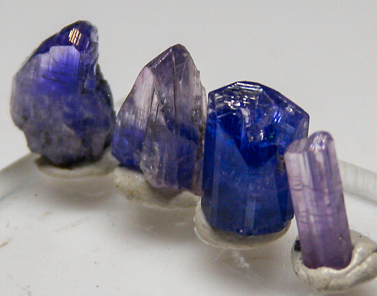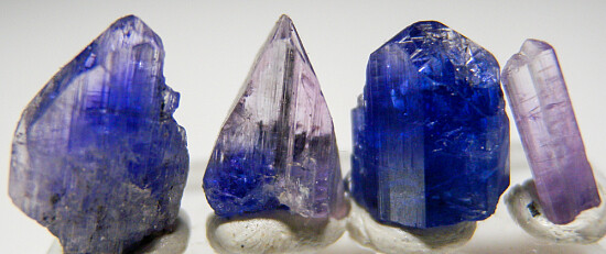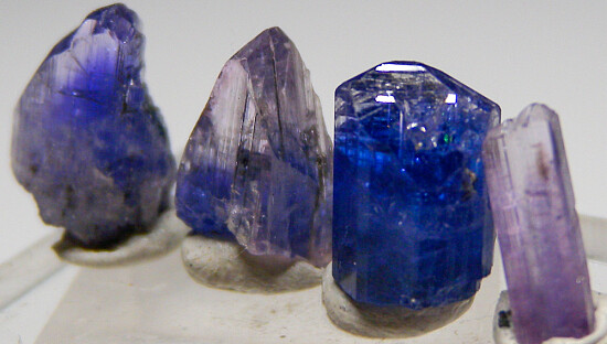 Tanzanite color suite of 4 crystals. From left to right: color-zoned Tanzanite crystal, pink over blue bi-color crystal, deep blue Tanzanite, and lastly a rare pink Tanzanite. All are terminated and complete all around.