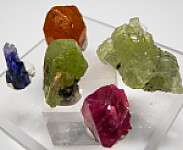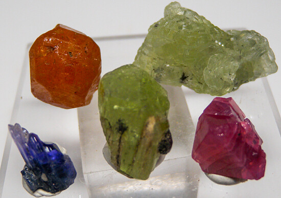 Colorful suite of gem minerals from Tanzania. Included are: 1.3cm pink Spinel from Mahenge; a 2.7cm cluster of translucent yellow Prehnite crystals from Merelani; a 1.2cm bicolor Tanzanite (pink over blue) from Merelani; a 1.5cm Spessartine from Loliondo; and a 1.5cm green Diopside from Merelani.