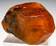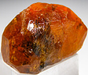 A single gemmy crystal of orange Spessartine from Tanzania. The Spessartine has good color and clarity. This crystal grew between other Spessartine crystals and is contacted on various sides showing striations from other crystals.