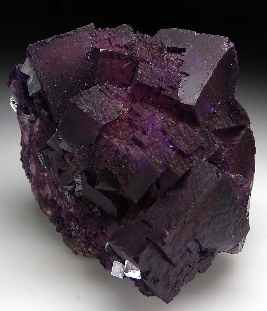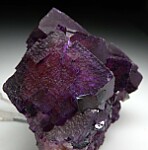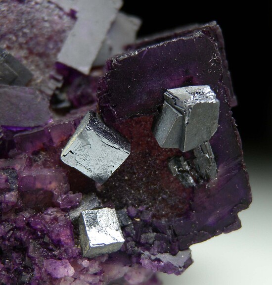 Cubic Fluorite with Galena from Illinois. The Fluorite is purple over a yellow core. Small cubes of Galena are attached to the front.