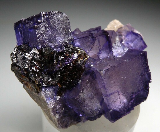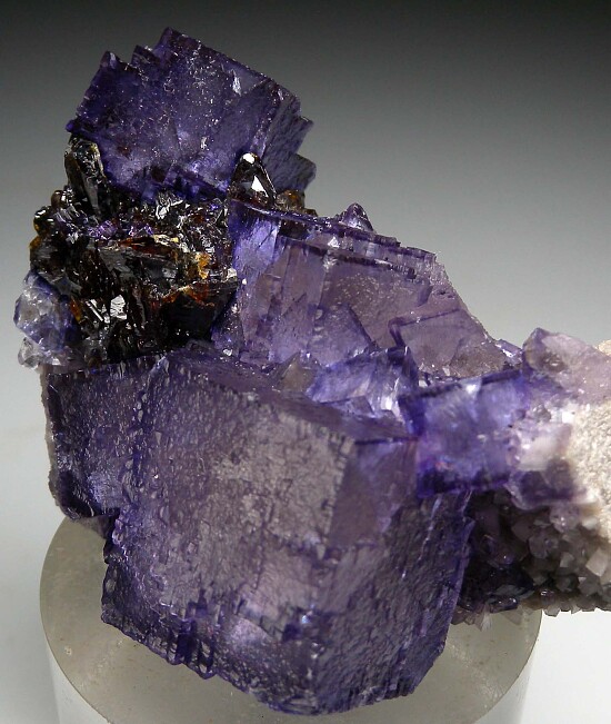 Purple cubes of Fluorite with deep red Sphalerite from the Elmwood Mine. The largest cube is 3cm on the diagonal.