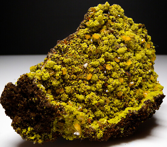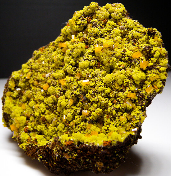 Limonite matrix with a large, flat display face covered by greenish yellow Mimetite and orange Wulfenite crystals. The Mimetite form small rounded clusters and the Wulfenite are well dispersed and separated across the speciemn. The wulfenite and translucent to transparent. Large, colorful specimen.