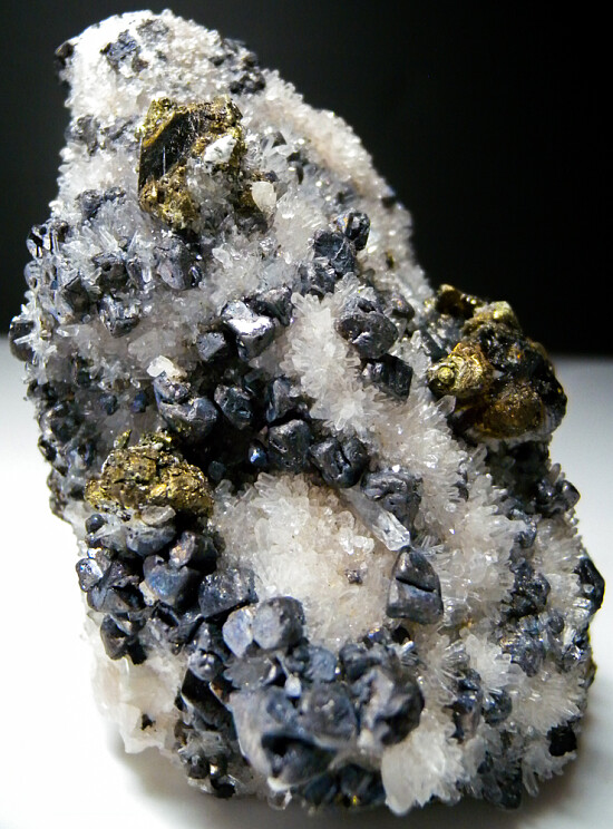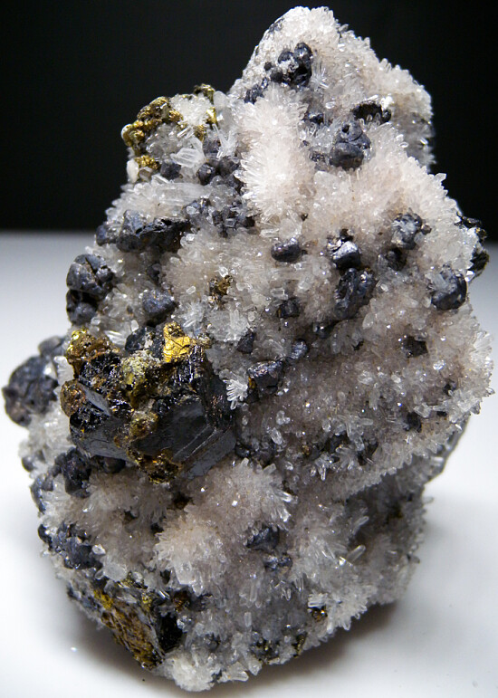 An interesting and large specimen composed of multiple species of minerals. The matrix is a large knob-shaped mass covered on all sides by tiny clear Quartz crystals. There are small 'melted' looking Galena crystals all round amongst the Quartz crystals, as well as larger, sharp Sphalerite crystals and the occassinal golden Chalcopyrite crystal. Great crystals all around, with an old label on the bottom that notes Bournonite but I don't see any.