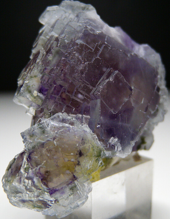 Glassy and gemmy cluster of transparent purple and light blue Fluorite crystals. The Fluorite are stepped cubic crystals and water clear.