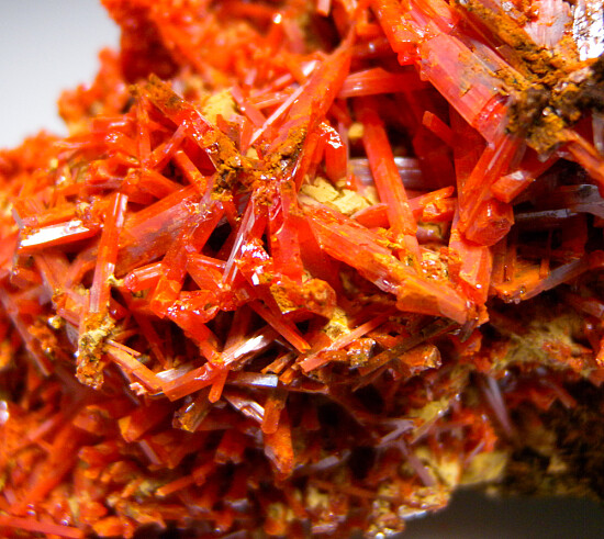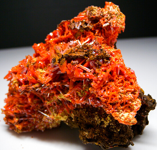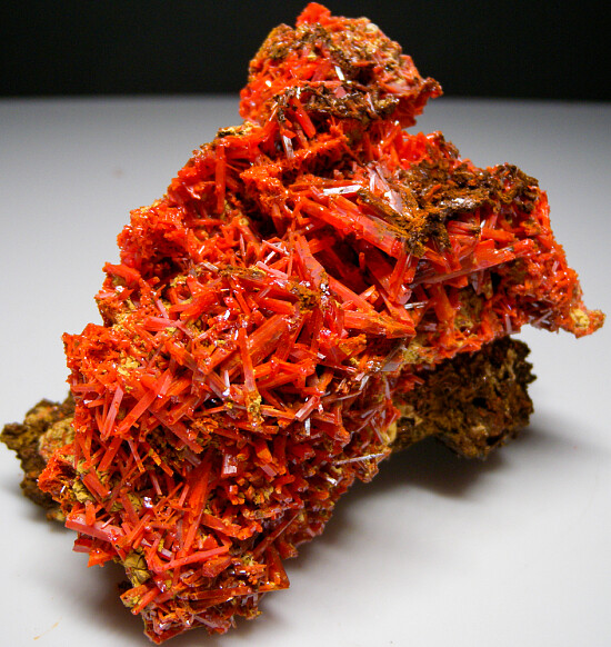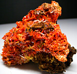 Cluster of bright, firey red/orange Crocoite crystals from the Adelaide Mine. Masses of intergrown crystals atop a limonite matrix.