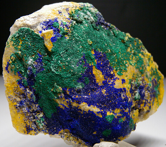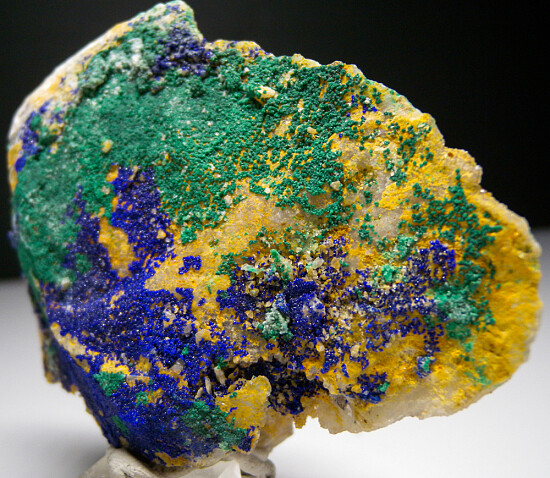 Combination of tiny, sparkling Azurite crystals and small spherical crystals groups of Malachite atop a matrix of solid white Quartz.