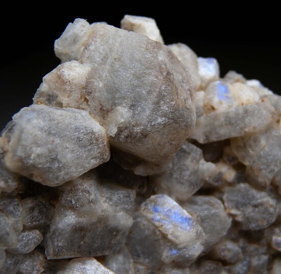 Recent find of crystallized moonstone from Tanzania. Individual crystals to 2cm that display a satiny blue color when turned under lighting. This 'Schiller effect' of color is seen at different angles on the different crystals and was therefore not possible to catch in still photos and these are therefore more colorful and attractive in person. Moonstone crystals are rare! Sawcut on backside.