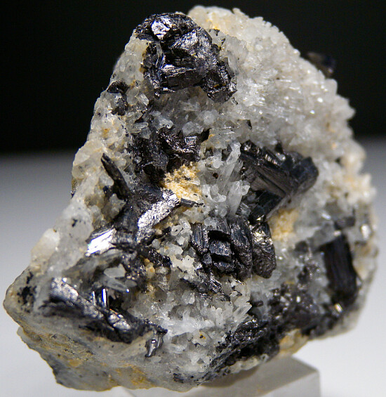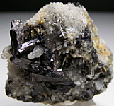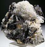 Black crystals of Enargite and tiny clear Quartz crystals on the front, top, and back of this historic specimen from one the western USA's last mining boomtowns. Not common elsewhere, Enargite was one of the major ores of Copper at Butte. This one has great crystals on both sides, hard to decide which is better! Valued at $250.