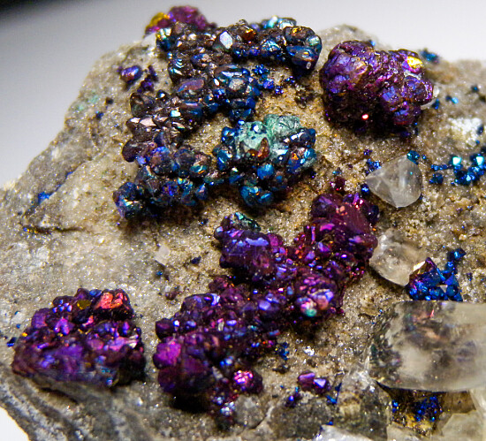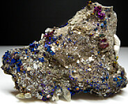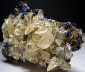 Flashy, irridescent Chalcopyrite with translucent to transprent yellow Calcite crystals from the famous Sweetwater Mine. The Chalcopyrite exhibit bright blues, purple, and gold colors. The Calcite crystals are on one side while the Chalcopyrite are on both the front and back sides. Flashy, exciting piece!