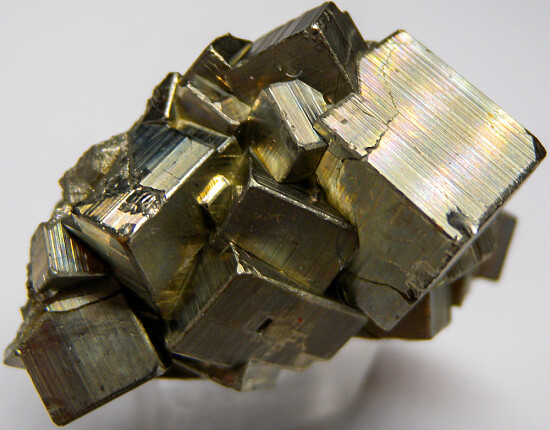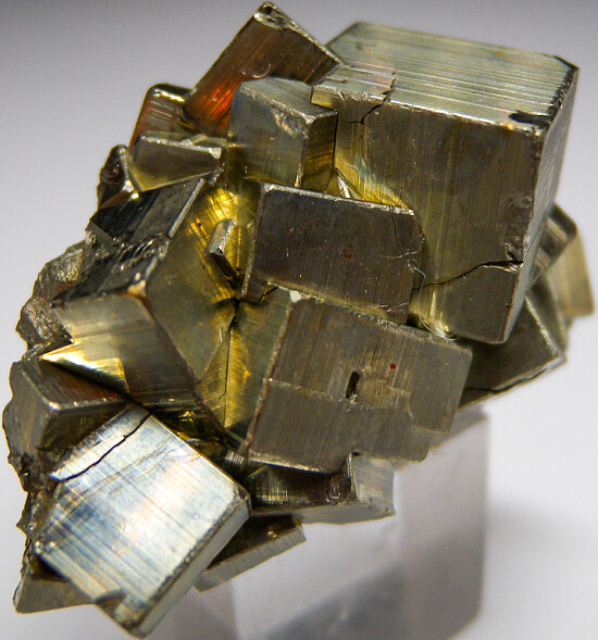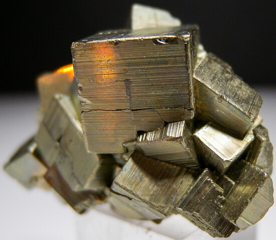Classic and aesthetic cluster of Pyrite cubes from the Huanzala Mine in Peru. Individual crystals to 1.8cm in size with bright, brassy metallic luster and striations on the surface.
