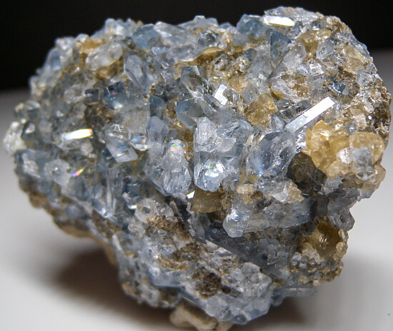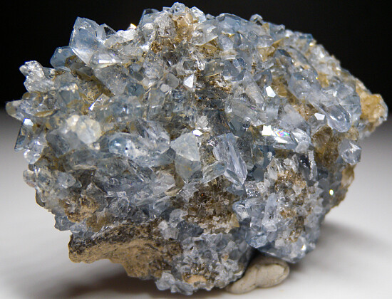 Glassy, transparent crystals of blue Celestite on matrix from Madagascar. Bright, sharply formed crystals to 2cm in size are present on both the front and back of specimen.