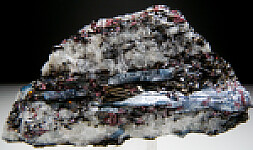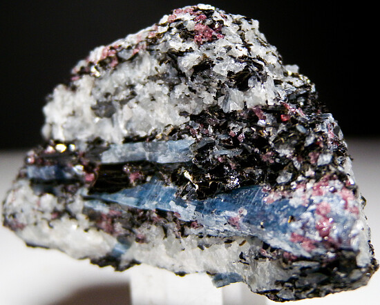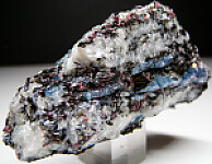 Deep blue crystals of Kyanite with red Rhodolite garnets in a matrix of platy black Biotite and white Quartz.