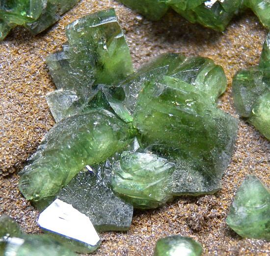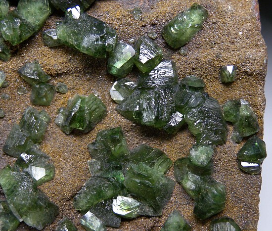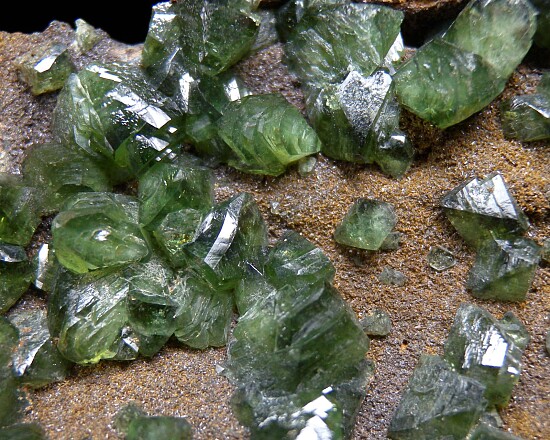 Glassy bright green Ludlamite crystals on matrix from a relatively new locality in northwestern Brazil. The crystals are bright, translucent to transparent, and reach 1.5cm in size. Gorgeous specimen of exceptional quality for the species.