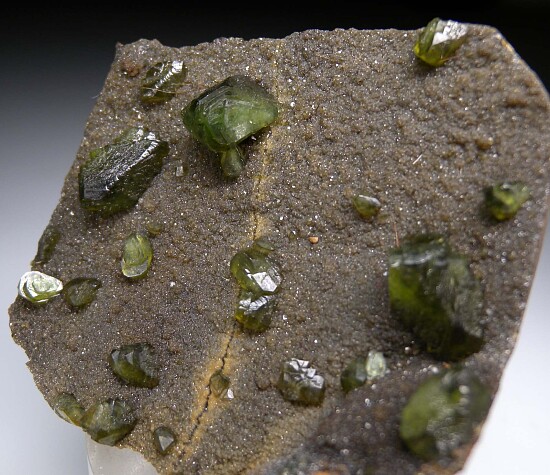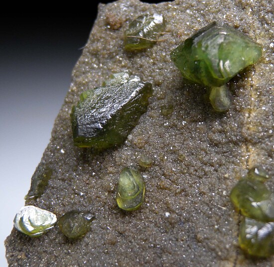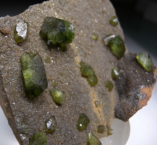 Glassy bright green Ludlamite crystals on matrix from a relatively new locality in northwestern Brazil. The crystals are bright, translucent to transparent, and reach 1.4cm in size. Gorgeous specimen of exceptional quality for the species, valued at $350.
