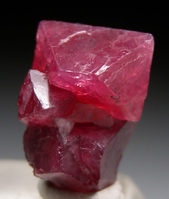 Cluster of sharp red Spinel crystals with a small amount of attached white Calcite matrix. The top Spinel is well formed, complete, translucent and 1.3cm wide.