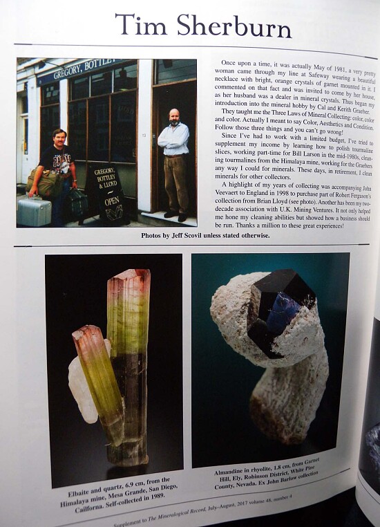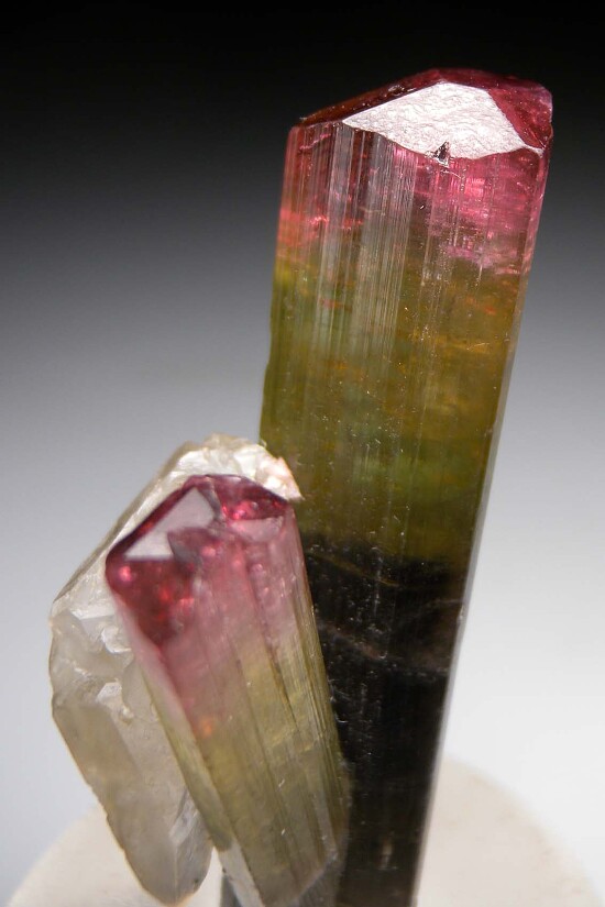 Branching, multi-colored Tourmaline specimen from the gem pegmatites of southern California. Gemmy green crystals with rose-colored terminations(more red than typical pink). This is unusual in that most Himalaya Mine Tourmaline are single crystals and this branching specimen, with an attached doubly-terminated Quartz, is particularly aesthetic. The large Tourmaline is also doubly-terminated. Ex. Tim Sherburn collection. Tim's label notes that it was self-collected by Tim in 1989 during a collecting trip with Peter Lyckberg. It has an indentation from another crystal on the side, and has one repair. This was one of Tim's most prized specimens in his collection and was shown on the first page of Tim's section in the California collector edition of the Mineralogical Record.