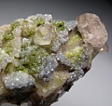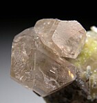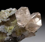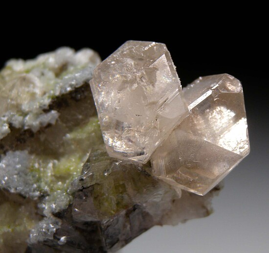 Glassy, gemmy Cerussite crystals atop Calcite crystals partially coated by green Duftite. The Cerussite are very bright and lustrous and reach 1.8cm wide. Well crystallized all around, it's nearly a floater with just one small point of contact on back.