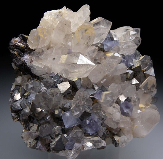 Transparent blue Fluorite cubes and Aresenopyrte crystals grown among glassy clear Quartz crystals. This is an older piece (about 20 years) reecently acquired out of a collection and has a distinct and different appearance that more recent specimens from this mine. There are also a few small Ferberite crystals present.