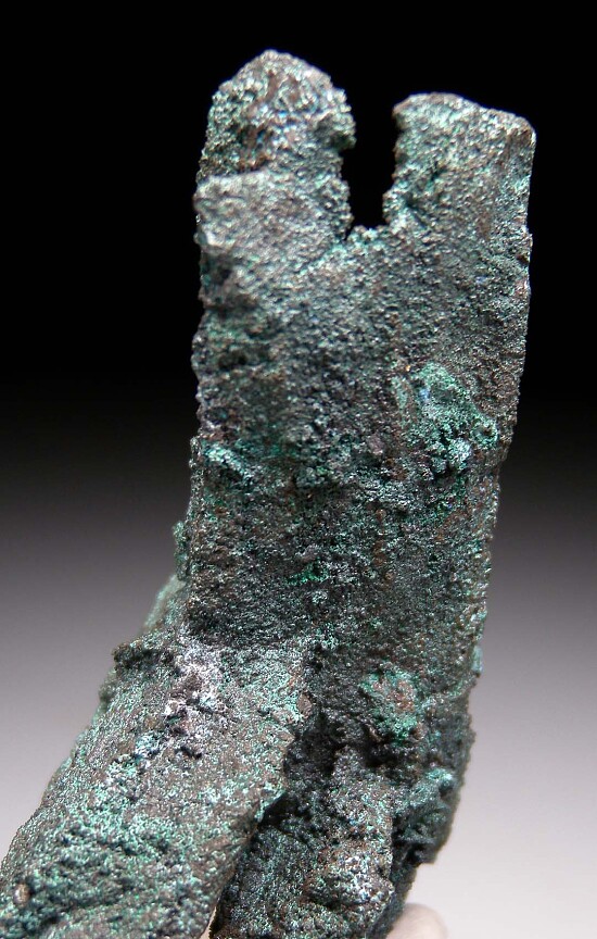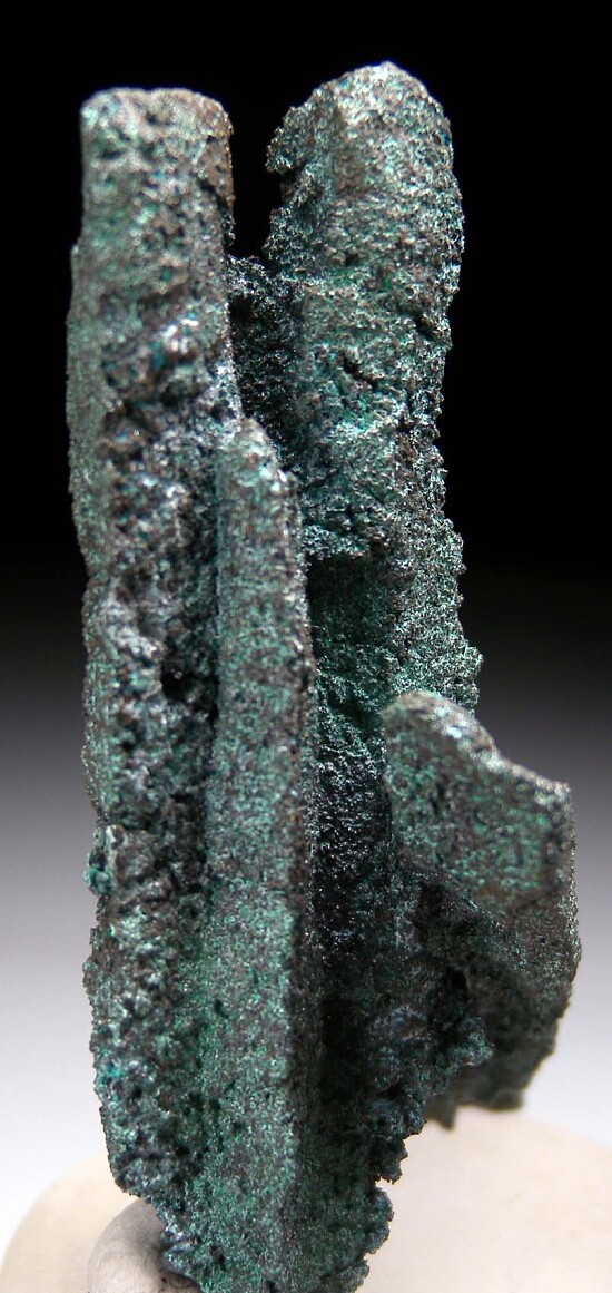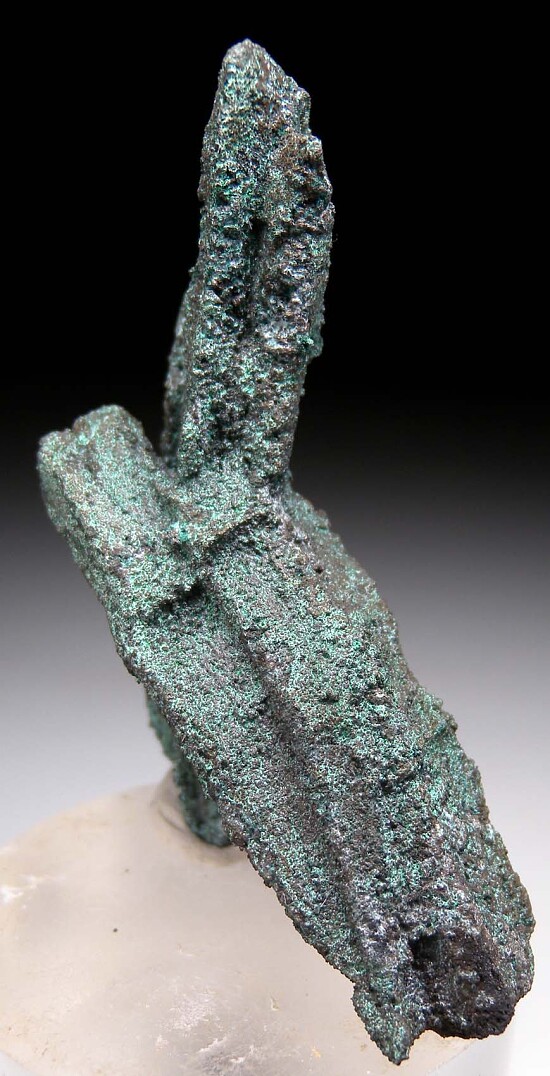 Crystal cluster of Tennanite after Azurite from Tsumeb. Elongated, primatic crystals of former Azurite that have been pseudomorphed to Tennantite. An undamaged cluster with individual crystals to 7cm in length. This piece was mined from the first oxidation zone of Tsumeb. This type of pseudomorph only occurred at Tsumeb, and then only rarely.
