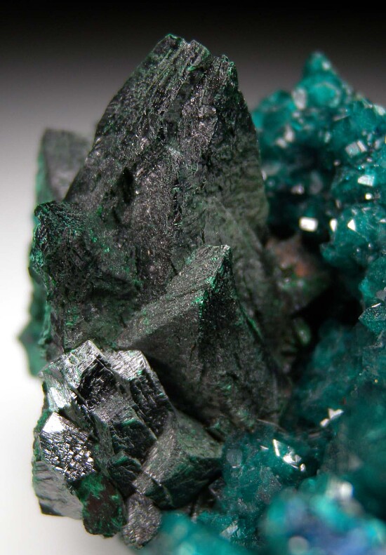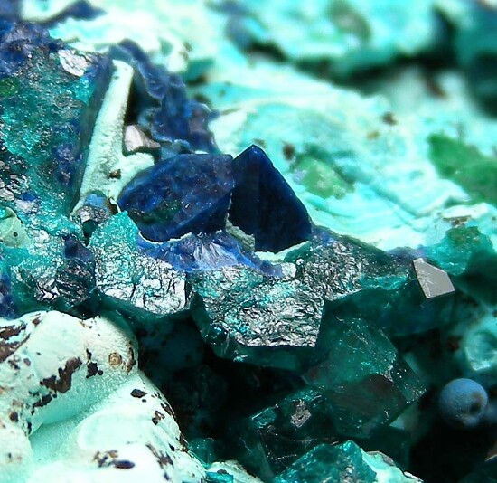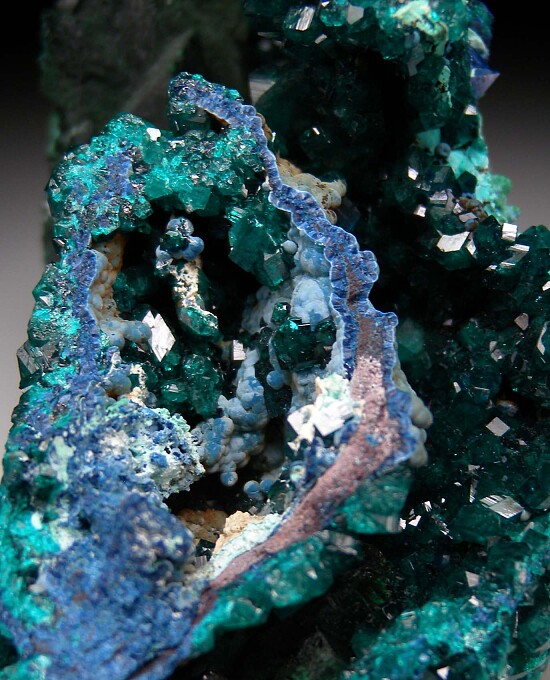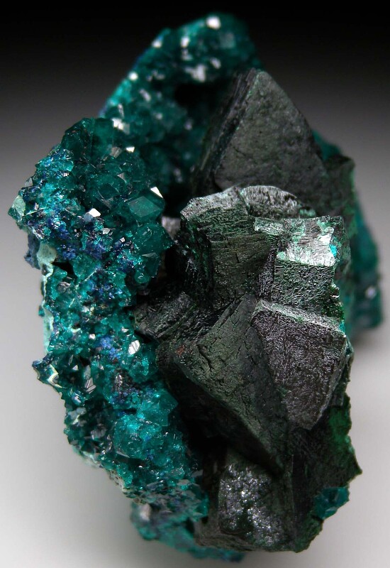 Malachite on Dioptase with Shattuckite pseudomorphs