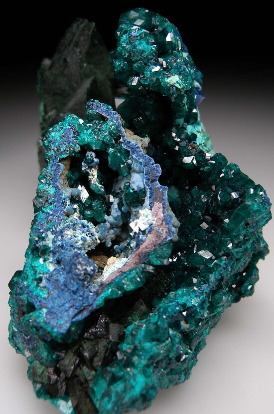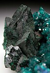 Large specimen of Dioptase, primary Malachite crystals, and Shattuckite. Though not a classically perfect specimen (the front of the Malachite cluster is contacted by the opposing pocket wall), it is none the less large, impressive, and very interesting. Also, I got it in trade and have it priced to move. To start with, the cluster of Malachite crystals is nearly 6cm wide and composed of huge individual crysals that are sharp and pointed. There is no rock matrix - the rest of the specimen is composed entirely of Dioptase crystals, Shattuckite, and Chrysocolla. On the right side there is a large open vug lined with botryoidal Shattuckite and Dioptase crystals. On the back, there are at least a few small crystals of the rare double pseudomorph of Shattuckite after Dioptase after Calcite. All in all, a highly interesting and representative specimen from the Tantara Mine.