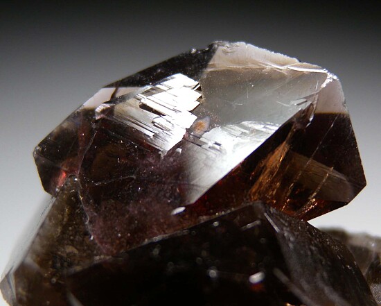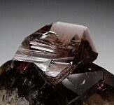 Fine miniature composed of a sharp, transparent purple crystal of Axinite atop transparent smokey Quartz crystals. The Axinite is 2.5cm wide, transparent, and perfect on both sides. Comes with an old Frazier's Minerals label.