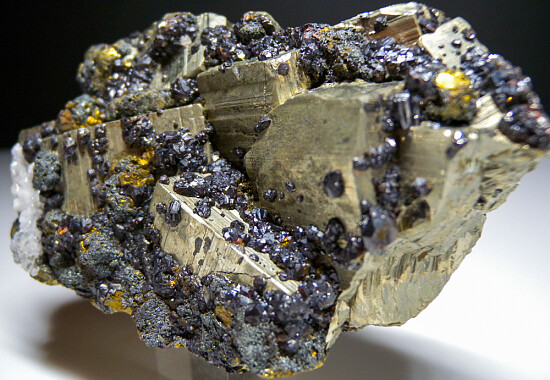 Large and spectacular, showy specimen composed of large cubes of Pyrite with attached Sphalerite, Chalcopyrite, and drusy Quartz crystals. The Pyrite crystals reach over 3.5cm on edge and have wonderful striated crystal faces. The specimen itself is solid Pyrite. A heftly, solid and colorful display specimen.
