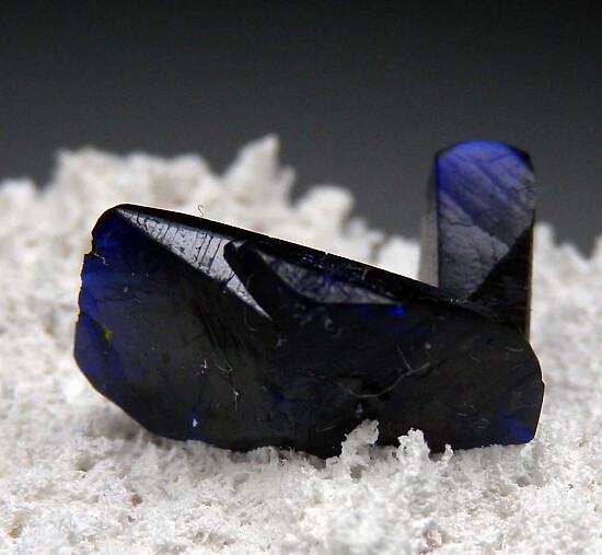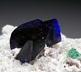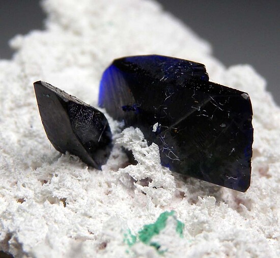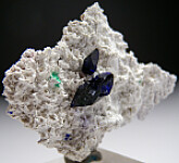 Two translucent crystals of Azurite on stark white matrix. with small areas of green Malachite. These are fine quality crystals from the Volborthite pocket and reach 1.1cm in size. If you prefer quality over size. this is for you with pristine Azurite crystals set perfectly for display in the center of the white matrix.