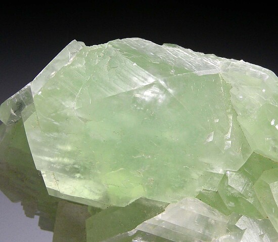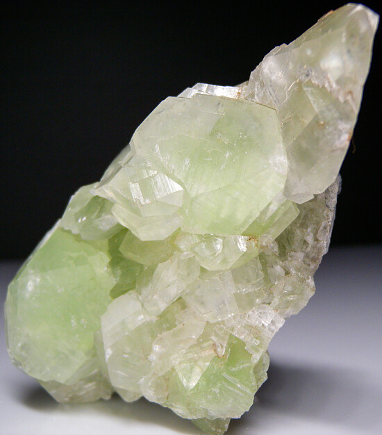 Unusual green crystals of Calcite from China. This specimen was acquired out of a collection and is about 20 years old (to the previous collector). It has relatively flat, striated crystals to 3.5cm wide with apple green color.