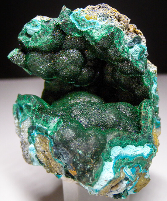 Thick layers of green Malachite over sky blue Chrysocolla lining a vug in a rock matrix. The surface of the Malachite is sparkling and wonderful banding can be seen along the edges. Classic specimen from the copper zone of the DR Congo.