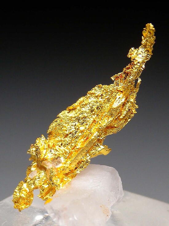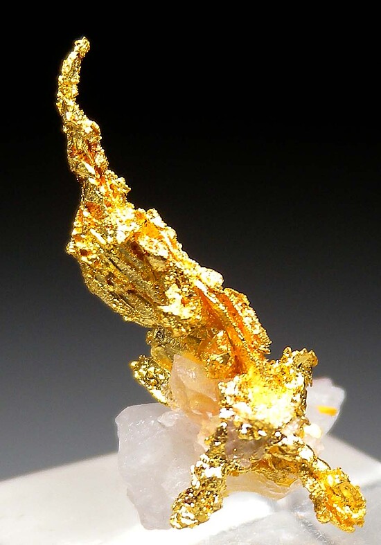 Colorful 2.4cm spinel twinned Gold crystals attached to a Quartz crystal.