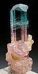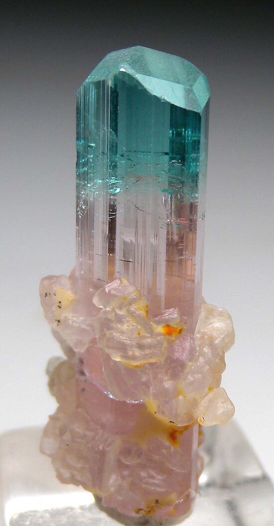 Stunning pink Tourmaline with a blue/green tip that is surrounded by Lepidolite at the base. This one has a lot of visual impact with strong colors and high transparency. It's perfectly crystallized and undamaged all around and is doubly-terminated. Just released from a private collection, it was expensive but too good to pass up.