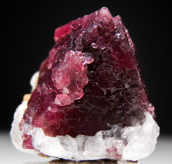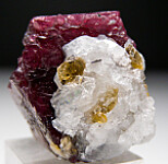 Large red octahedral Spinel crystal in white marble with golden mica.