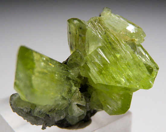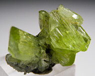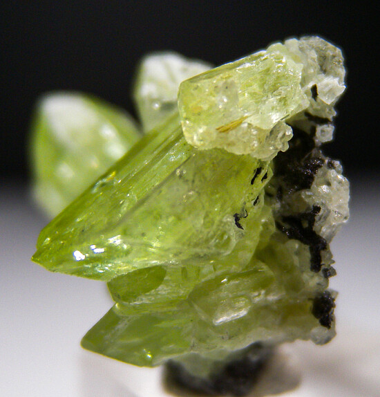 Spikey cluster of green Diopside crystals from Tanzania. This is an aesthetic cluster with gemmy crystals sticking out in different directions forming an attractive cluster. With Graphite crystals.