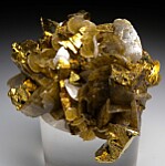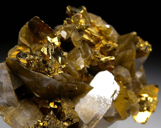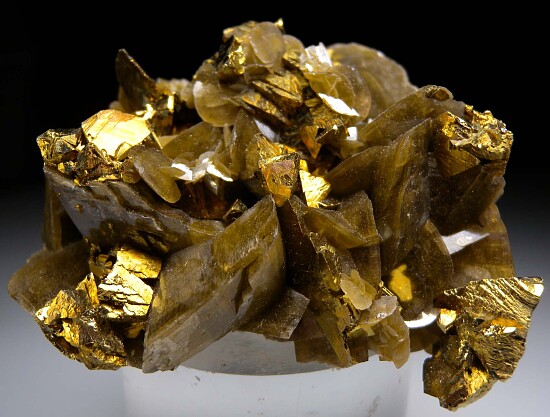 Bright metallic Chalcopyrite crystals intergrown with translucent, tan Siderite crystals. This is a well balanced example from this find in excellent condition with plenty of Chalcopyrite crystals well dispersed among the Siderite crystals.