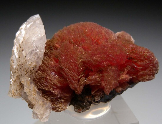 Densely packed, rounded clusters of red Inesite crystals with attached white Calcite crystals. A superb example from N'Chwanning much better than the more common drusy coatings of crystals. Complete and well crystallized all around.