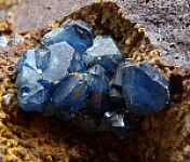Large open vug in Limonite lined by small Scorodite crystals with a cluster of larger blue Scorodite crystals towards the top of the vug. The largest crystals reach 6mm wide.