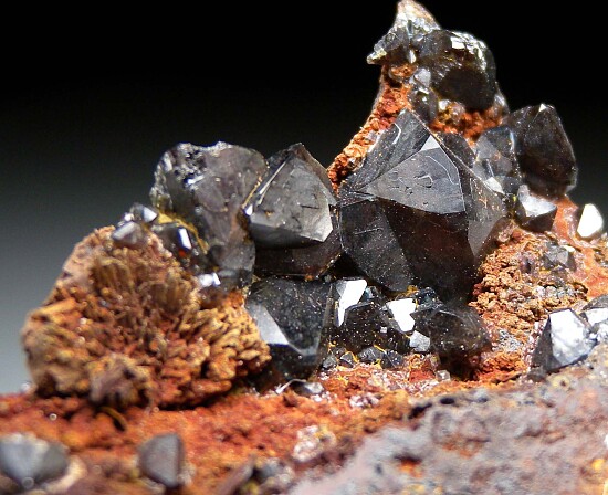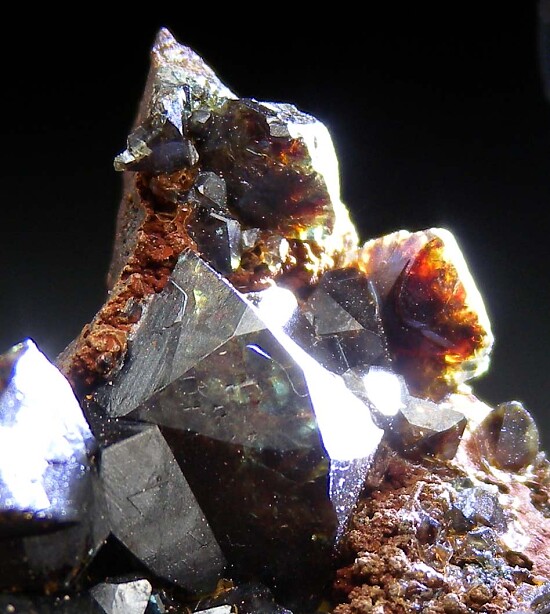 Large, well formed Scorodite crystals on matrix. The crystals reach 1.3cm wide. When backlit the crystals show red coloration in areas. These were analyzed and trace Copper and Cobalt were detected which may be the cause of the red coloration.