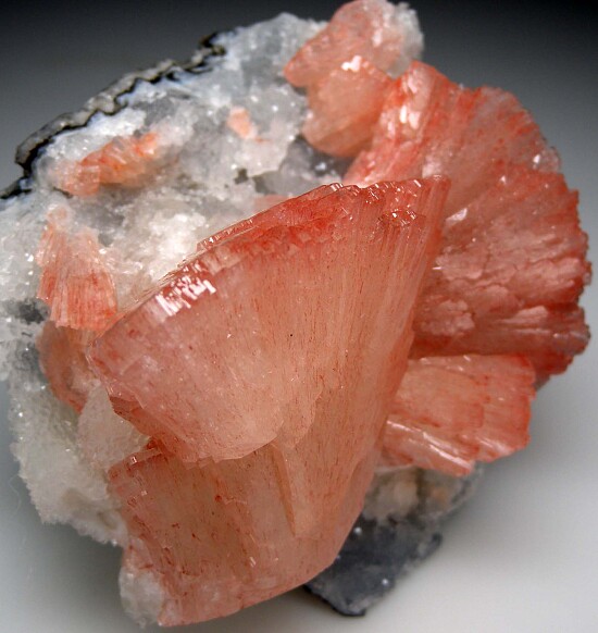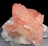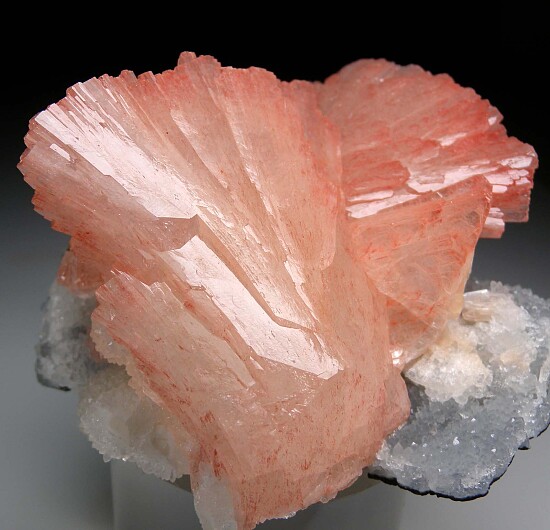 Large, fan-shaped crystals of pink Huelandite on a drusy Quartz crystal coated matrix. The main crystal is 6cm tall and all the Huelandite have great luster and are in perfect condition. Big and showy crystals, not your average Indian zeolite!!!