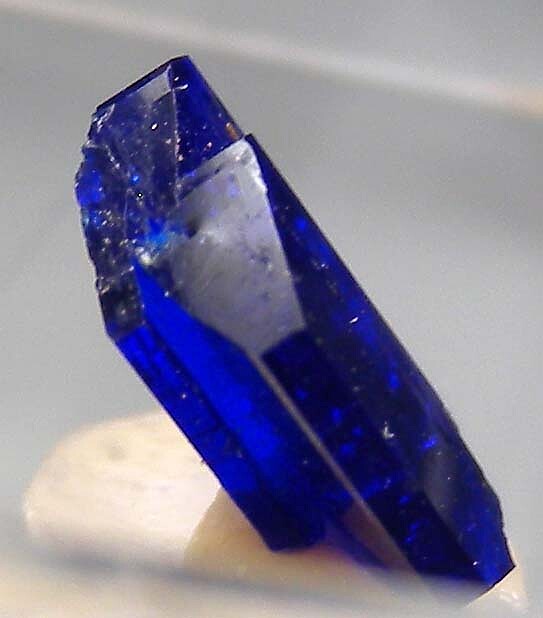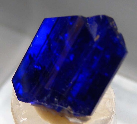 Small but perfect single Linarite crystal with sharp, flat termination faces. It's translucent to transparent with great electric blue color. Comes mounted in a small plastic box.